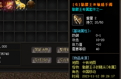 以上两种装备是幽冥至尊怪物的爆率,在爆率上总体来说偏高,而这个幽冥至尊怪物主要刷新在十转地图里面,玩家需要十次转生才能进入。